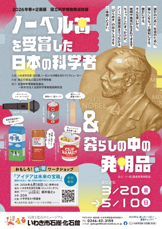 3月20日(金)より、企画展「ノーベル賞を受賞した日本の科学者」&「暮らしの中の発明品」展を開催します。 「ノーベル賞を受賞した日本の科学者」は国立科学博物館の巡回展、「暮らしの中の発明品」は一般社団法人福島県発明協会の … 続きを読む