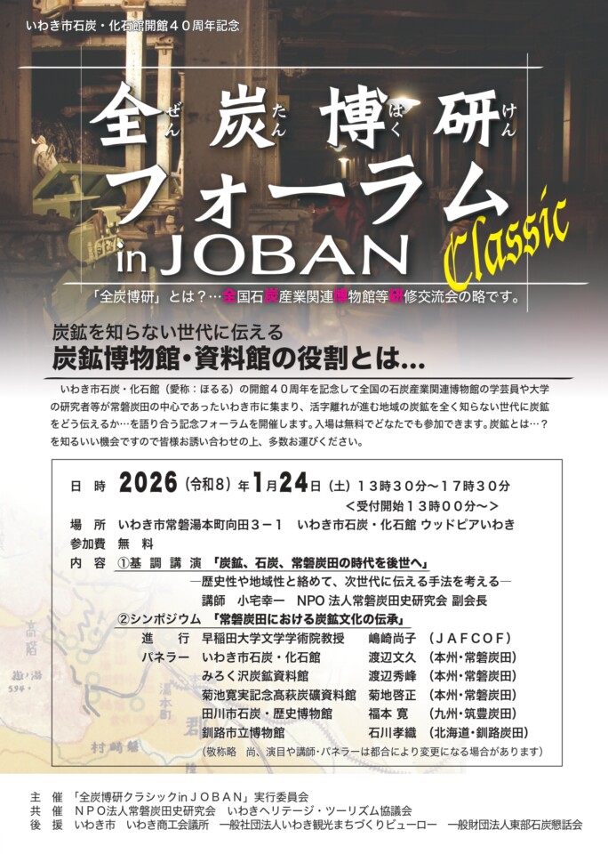 今年度は、いわき市石炭・化石館ほるるの開館40周年を記念して、常磐炭田の中心であったいわき市で、地域の炭鉱を全く知らない世代に炭鉱をどう伝えるか・・・を語り合う記念フォーラムを開催します!