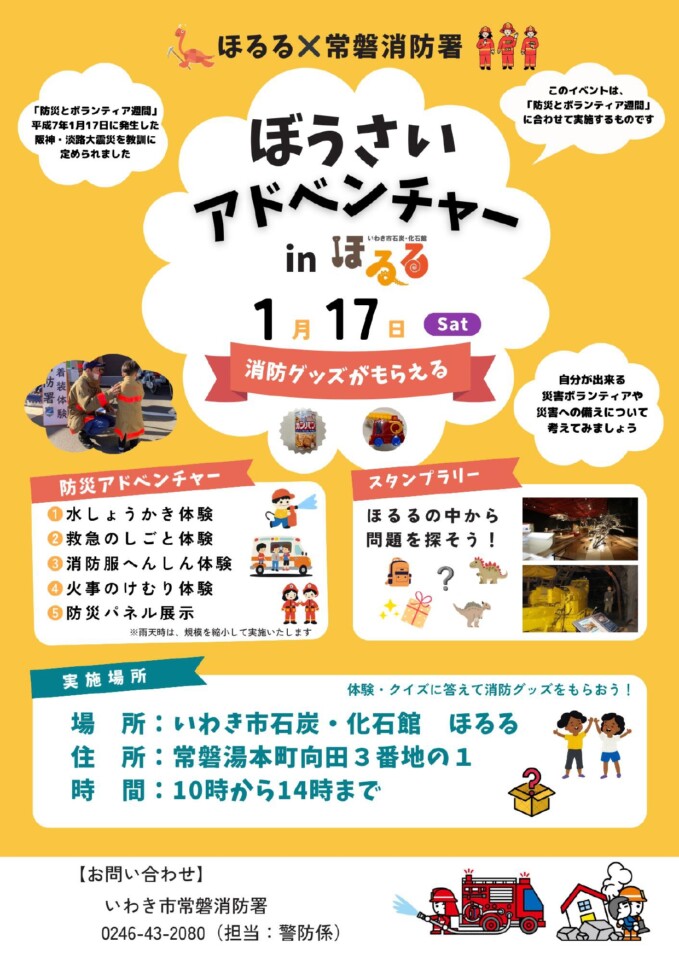 ぼうさいアドベンチャー in ほるる 開催 絵 1月17日(土)に ぼうさいアドベンチャー in ほるる を開催します。 このイベントは「防災とボランティア週間」に合わせて実施するものです。 イベント概要 ・消防車などの車両展示 ・防災アドベンチャー 水しょうかき体験、救急のしごと体験、消防服へんしん体験、 火事のけむり体験など ・スタンプラリー ※スタンプラリーのみほるるの入館料が掛かります。 皆さまのご来場をお待ちいたしております。